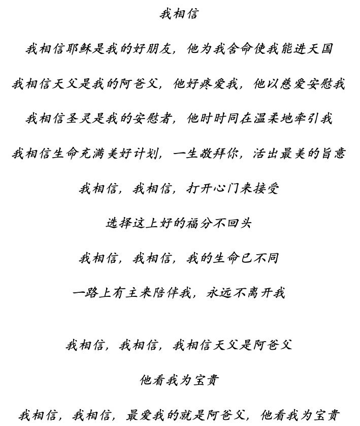 我低头仔细看,竟然就是那首《我相信》的歌词。我对师母说:还没遇见你的时候,神已经让我放这首诗歌给父亲听了。