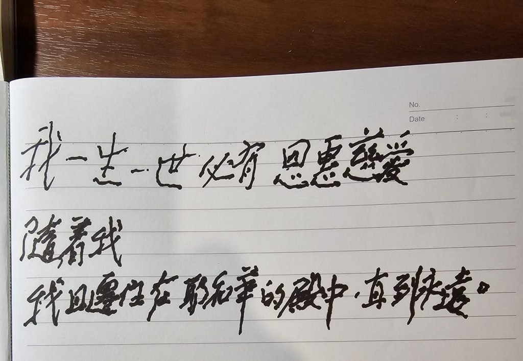 他看看我,没有点头,却接过笔,用抖得厉害的手在纸上落下:我一生一世必有恩惠慈爱随着我;我且要住在耶和华的殿中,直到永远。