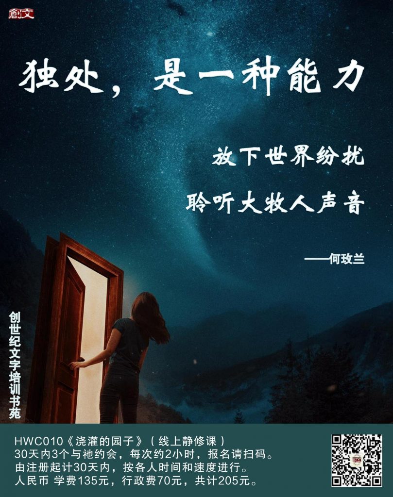 独处是一种能力。放下世界纷扰,聆听大牧人声音。欢迎查看文末海报,了解HWC010《浇灌的园子》。
