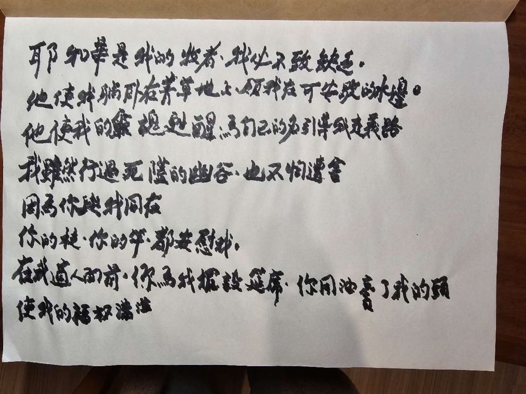 我欣喜若狂地拿出早就买好的纸笔,翻开诗篇23篇,他握着自来水毛笔(毛笔改良版,像签字笔),当“耶和华是我的牧者”几个字落在纸上时,我激动得眼眶含泪。