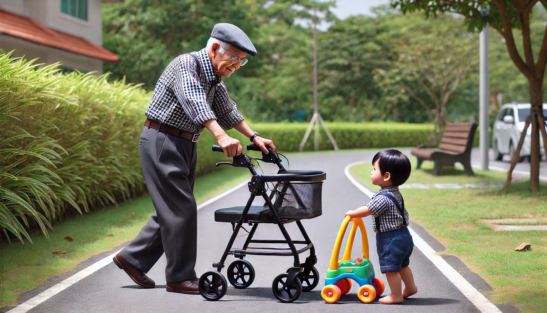 第二张,幼童和老翁都推着车子,但一是学步车,一是助行器,八九十年转瞬即逝!