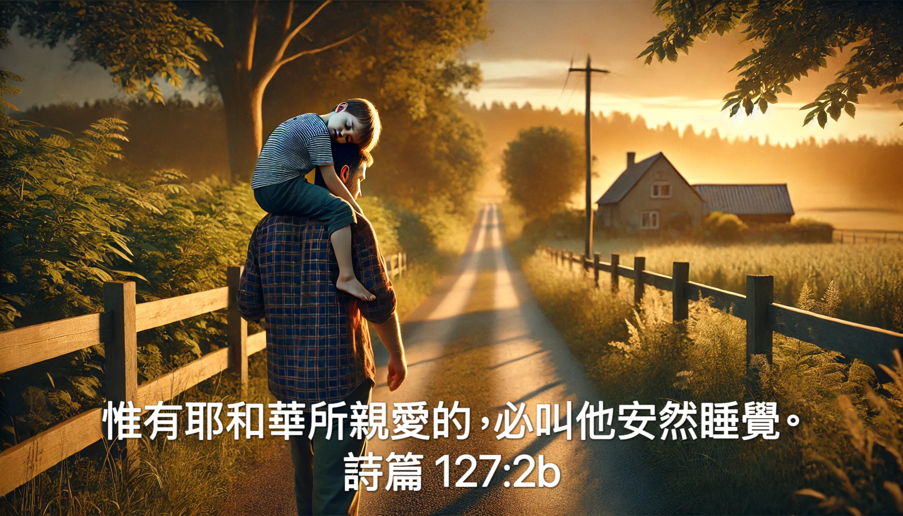 有一张图,是呼应诗篇里的一句话:“耶和华所亲爱的,必叫他安然睡觉。”一个小男孩,在外面跑了一天,累坏了,坐在爸爸肩膀上,抱着爸爸的头睡着了,爸爸还继续往回家的路上走。孩子虽然睡着了,还是在朝着目标前进。希望我们的生活有一天都能到这样的地步——全心信赖倚靠主,跟着主一直往我们的人生标竿直跑。