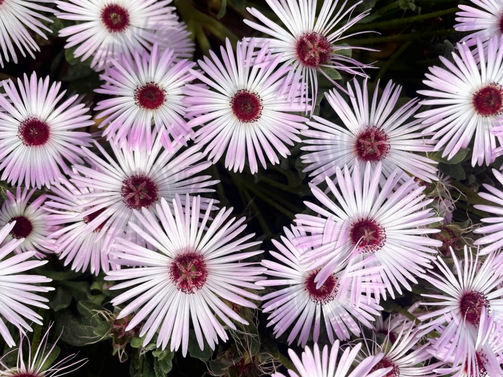 那些花的叶子和茎上布满了透明、闪亮的水晶球,远看以为是露珠,在阳光底下仿佛会跳舞。那花瓣薄如绸,多不胜数,呈放射状恣意舒展,宛如一件被巧手精心裁剪的碎纸太阳;花瓣是娇嫩的粉,有贝壳内里最羞赧的光泽,像熔化的琥珀滴落人间。这绝非羞涩的色调,而是大自然用最纯粹的颜料,在灰绿色画布上挥洒出的颂赞。